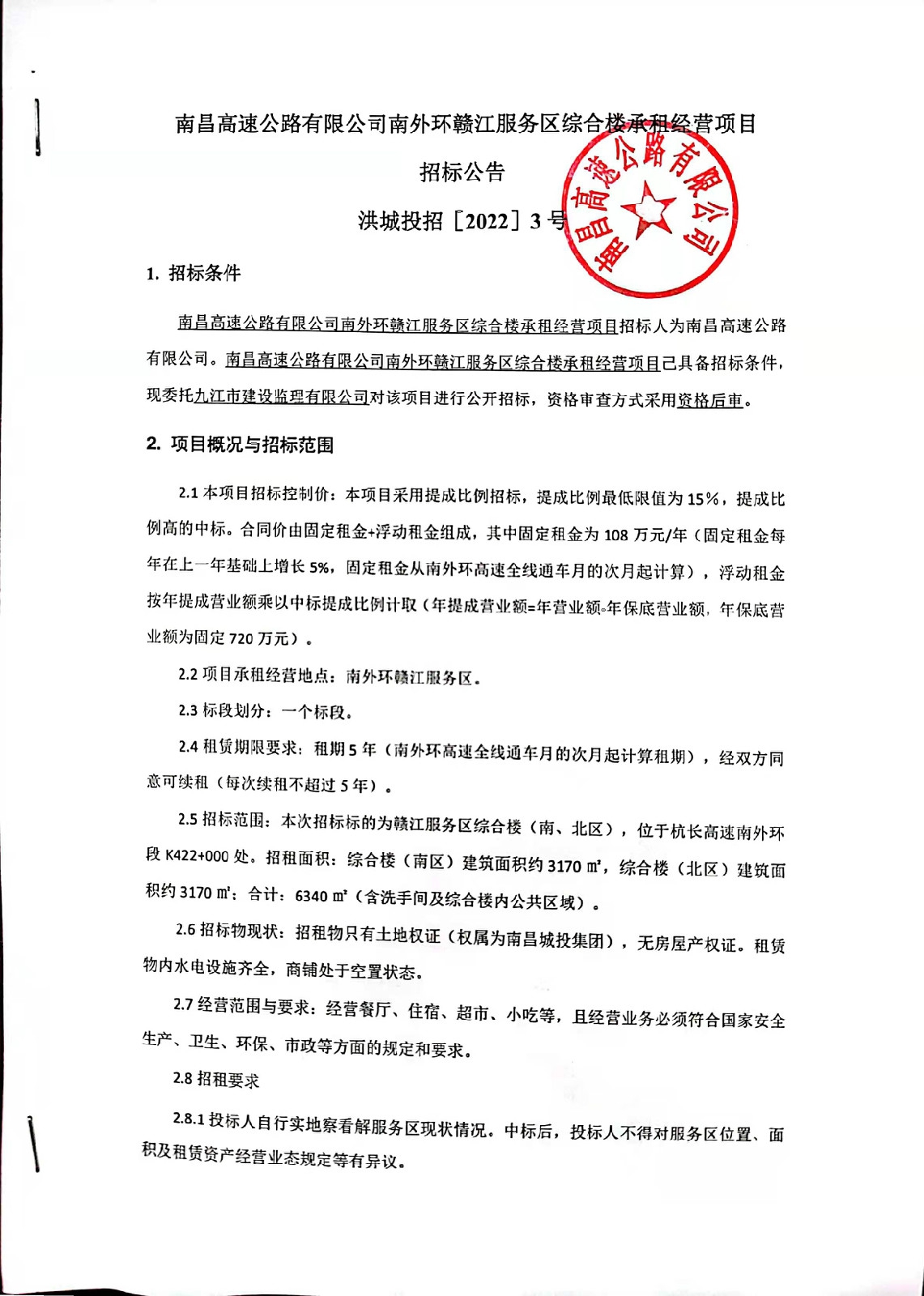 南昌高速公路有限公司南外环赣江服务区综合楼承租谋划项目招标通告