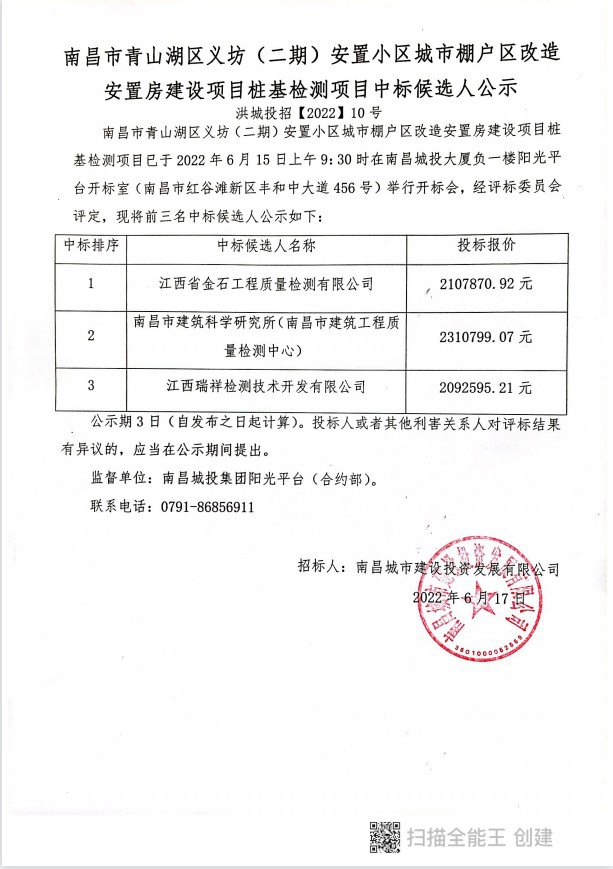 [公示]南昌市青山湖区义坊(二期)安顿小区都会棚户区刷新安顿房建设项目桩基检测项目中标候选人公示